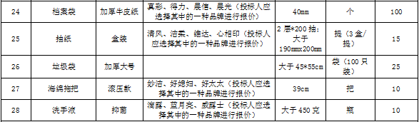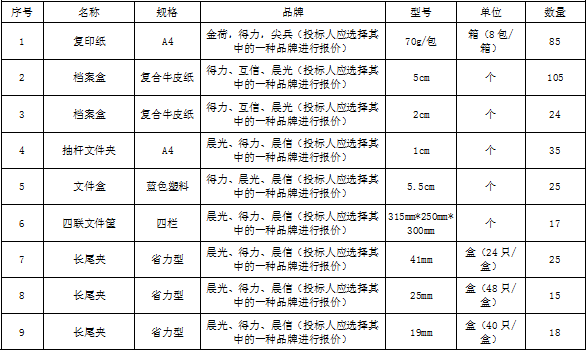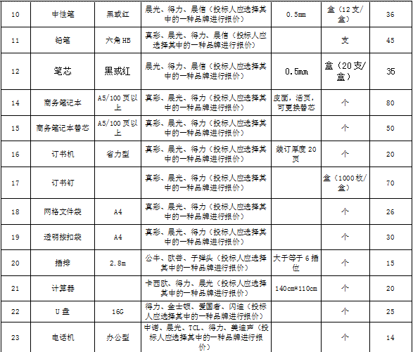 | 招標(biāo)范圍 | 包括但不限于辦公用品的生產(chǎn)供貨、包裝、運輸、檢測、驗收、質(zhì)保及售后服務(wù)等。如有漏項或缺項,投標(biāo)人承擔(dān)全部責(zé)任。 | ||||||||||||||||