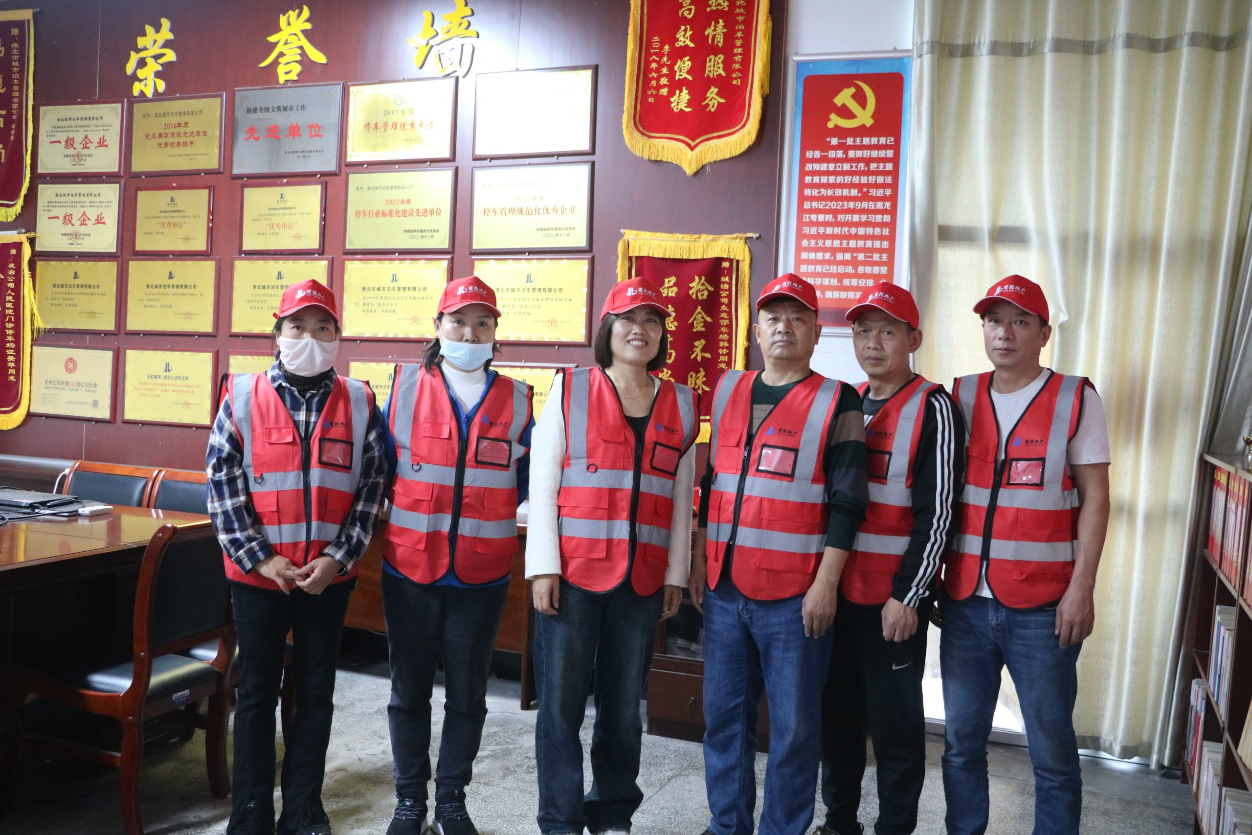新工作服馬甲、帽子以中國紅為主色調(diào),中間相間銀色反光條,形成極大的顏色反差效果,具有更加醒目的視覺效果,增強了收費員晚間或惡劣天氣工作條件下的安全性。同時,衣服的背面印有公司的logo及“淮北城泊”的字樣,辨識度更高,能夠進一步展現(xiàn)停車收費服務(wù)的良好形象,方便更好的開展停車管理及收費工作。