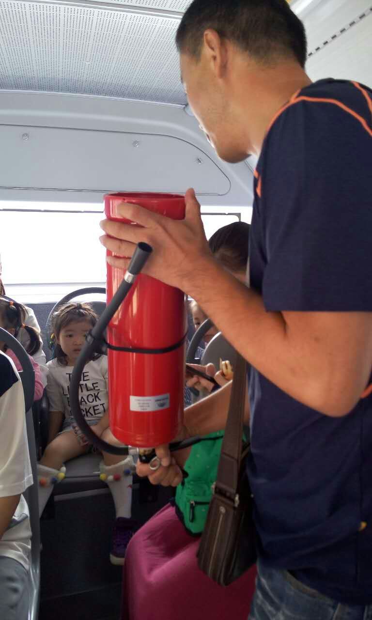 孩子們在家長陪同下,來到107路實驗三小站臺,工作人員詳細(xì)向孩子們講解安全文明乘車需要注意的事項。如何有序地安全上、下車?進(jìn)車廂內(nèi)為什么要扶穩(wěn)坐好?在公交車上與親人走散后怎么辦?如何使用安全錘、滅火器等常見的安全問題,提醒孩子們及家長乘坐公交車一定要遵守乘車秩序,安全文明乘車。接著,工作人員邀請小朋友及家長乘坐107路公交車,并模擬乘車過程遇到急剎車等突發(fā)狀況時的情景。同時與小朋友們互動,演示安全錘和滅火器的使用方法,這一環(huán)節(jié)受到家長的鼓掌點贊。
