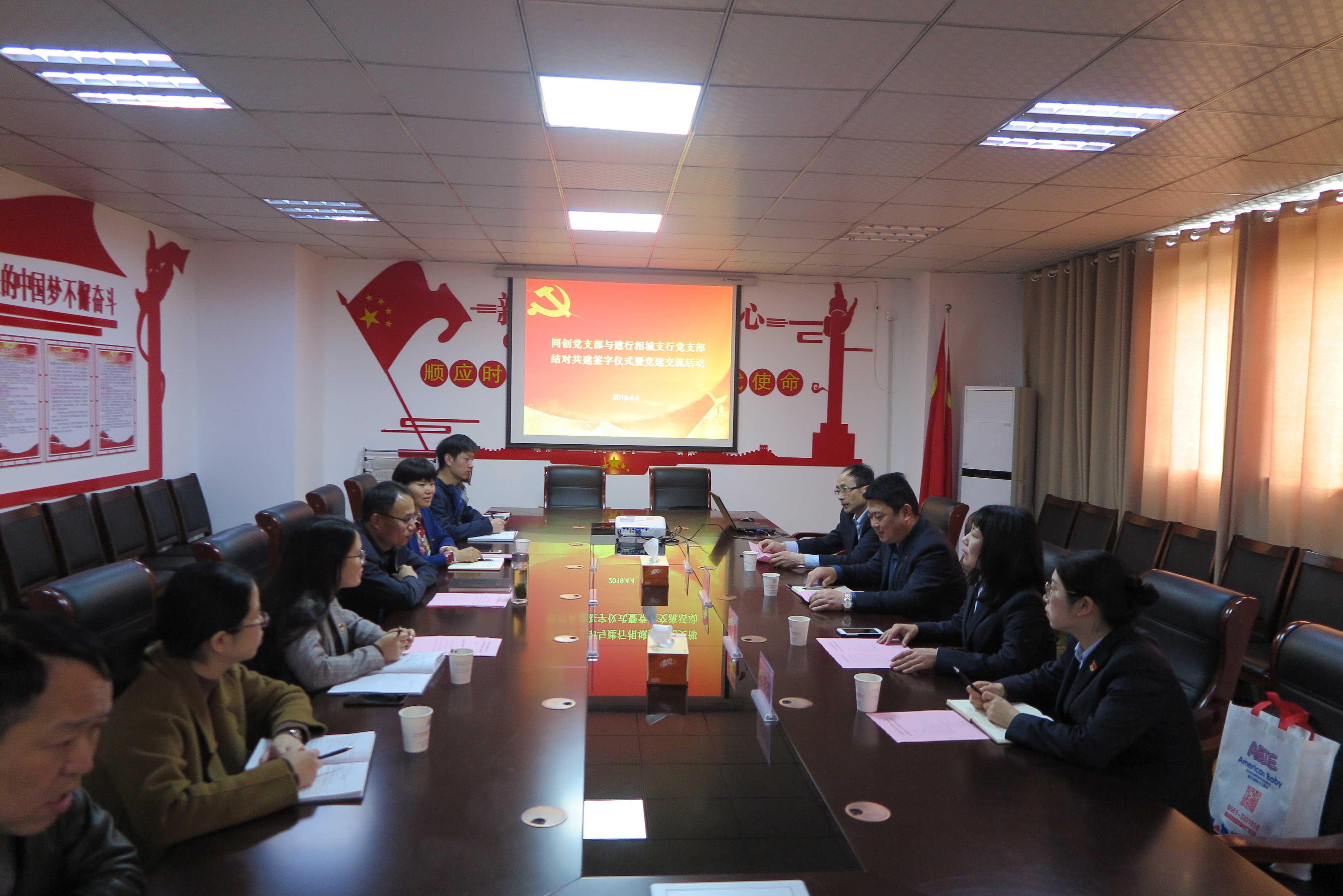 2019年4月4日,市同創(chuàng)擔(dān)保集團(tuán)黨支部和建行相城支行黨支部黨建工作結(jié)對共建簽字儀式在市同創(chuàng)擔(dān)保集團(tuán)會議室舉行。